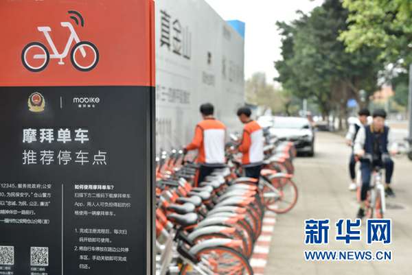 几名学生在福建省福州市的一处共享单车停车点取用共享单车(2017年4月12日摄)。新华社记者 宋为伟 摄