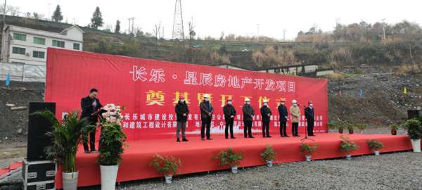 2021年1月26日上午,由AG网页版-AG(中国)承建的长乐▪星辰住宅项目奠基暨开工仪式在项目现场热烈举行。湖北省宜昌市五峰土家族自治县住房和城乡建设局副局长陈白华、县质量安全监督站站长邓简涛、AG网页版-AG(中国)五峰长乐▪星辰项目经理王国云,项目参建各方及新闻媒体共40余人出席。宜昌市长乐城市建设投资开发有限责任公司总经理刘鹏主持。